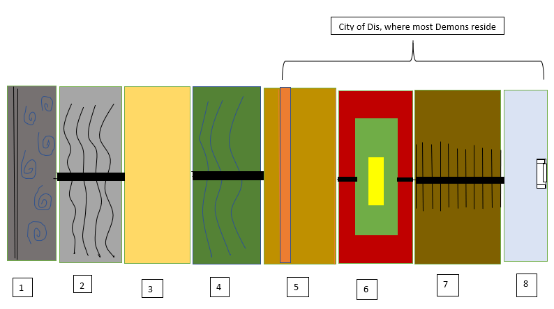Below are the concept pieces I made as layouts of Hell (mostly to help myself write it), based on other art made of Dante’s Inferno. Please remember that I am a writer and not an artist for a reason.